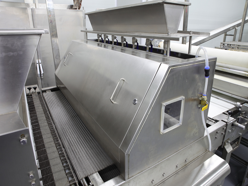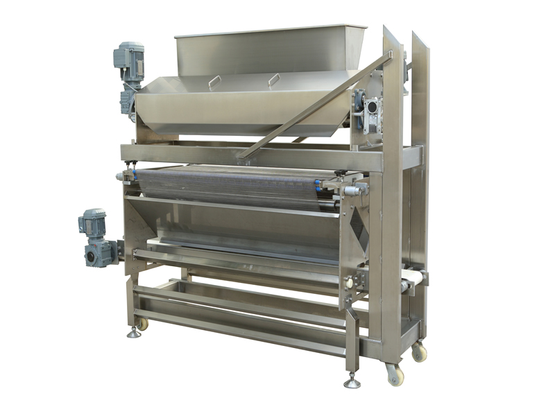 該設(shè)備應(yīng)用于將固體顆?;蛘叻蹱钫{(diào)味料,鹽,糖,芝麻及果仁片等撒布在面皮或則餅干上。回收機(jī)回收多余的撒布物料循環(huán)利用。