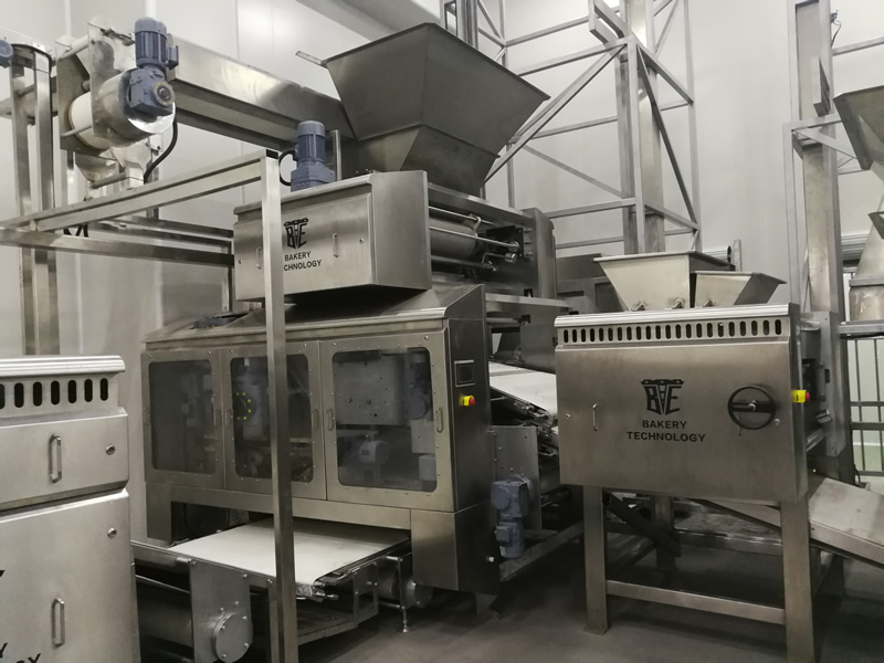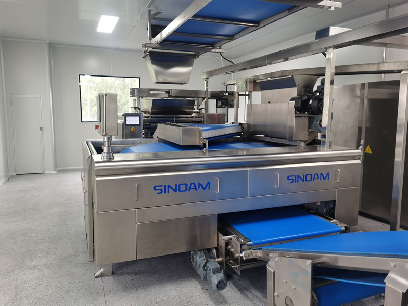 面團(tuán)通過(guò)疊層機(jī)三次壓軋,切片疊加至8~16層面皮。輸送至成型軋輥,該機(jī)能將回面始終處于面 皮底部,經(jīng)切片式疊層機(jī)生產(chǎn)出來(lái)的餅干層次感 強(qiáng)、口感松脆、酥化程度極高,配合機(jī)器上的撒 酥機(jī),可生產(chǎn)蘇打餅干和其它高檔餅干。
